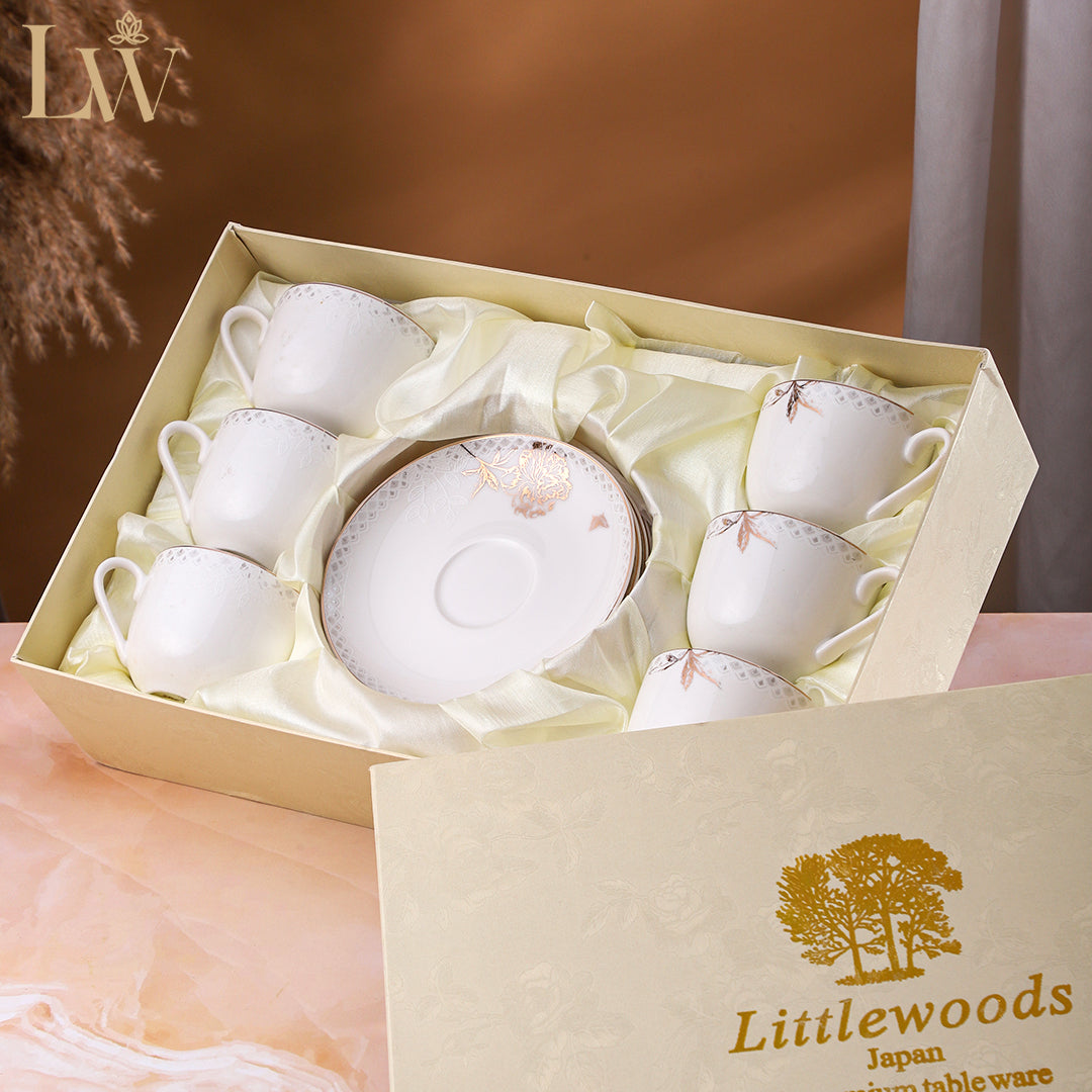 Each set includes 6 finely crafted cups and 6 matching saucers, perfect for serving guests or enjoying your own quiet indulgence. The smooth ceramic finish ensures durability and comfort, while the refined detailing adds a touch of luxury to every sip. Thoughtfully packed in a premium box, this set makes an excellent gift for weddings, anniversaries, or festive occasions.