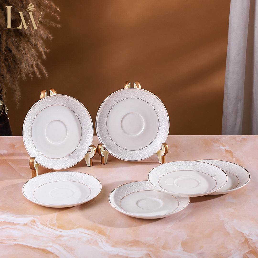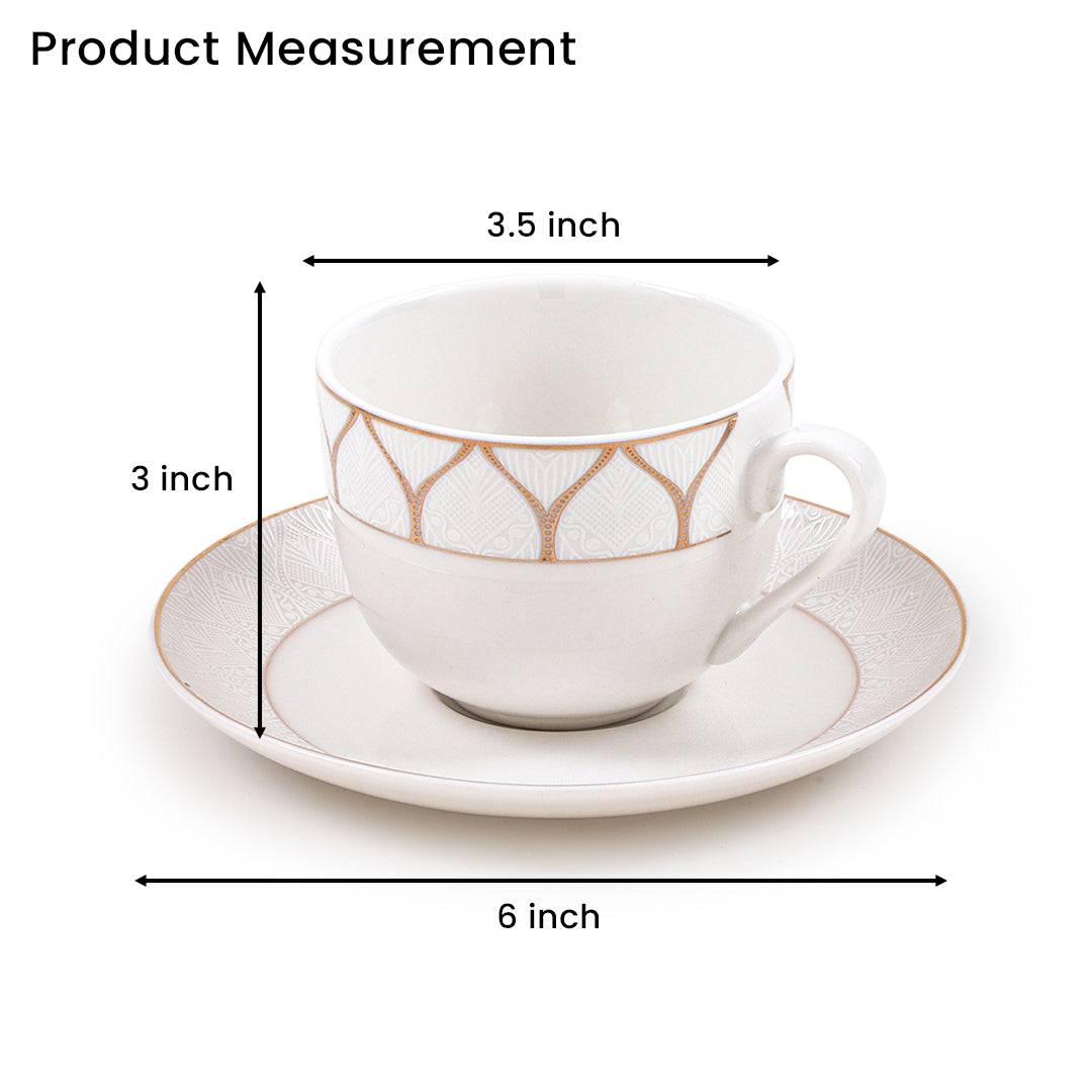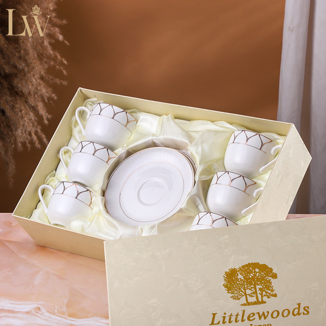 Each set includes 6 finely crafted cups and 6 matching saucers, perfect for serving guests or enjoying your own quiet indulgence. The smooth ceramic finish ensures durability and comfort, while the refined detailing adds a touch of luxury to every sip. Thoughtfully packed in a premium box, this set makes an excellent gift for weddings, anniversaries, or festive occasions.