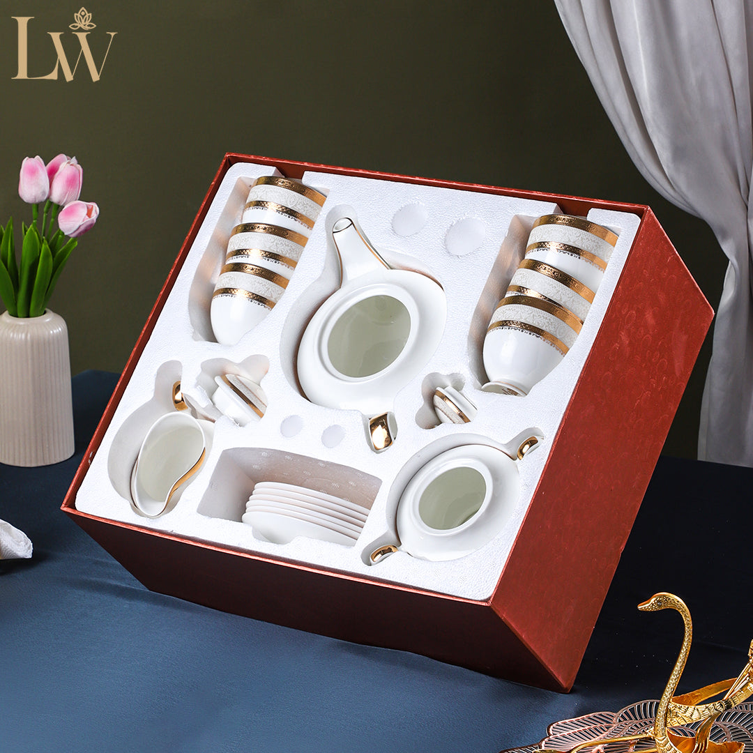 Indulge in the art of fine tea service with the Gold Band Luxe Teaset from the Luxe Collection by Littlewoods. Crafted with precision in premium porcelain and finished with 24k Gold Plating, this 15-piece set exudes timeless elegance. The refined dual-gold band design adds a regal charm, making it a perfect centerpiece for high tea, intimate gatherings, or a touch of luxury in everyday moments.