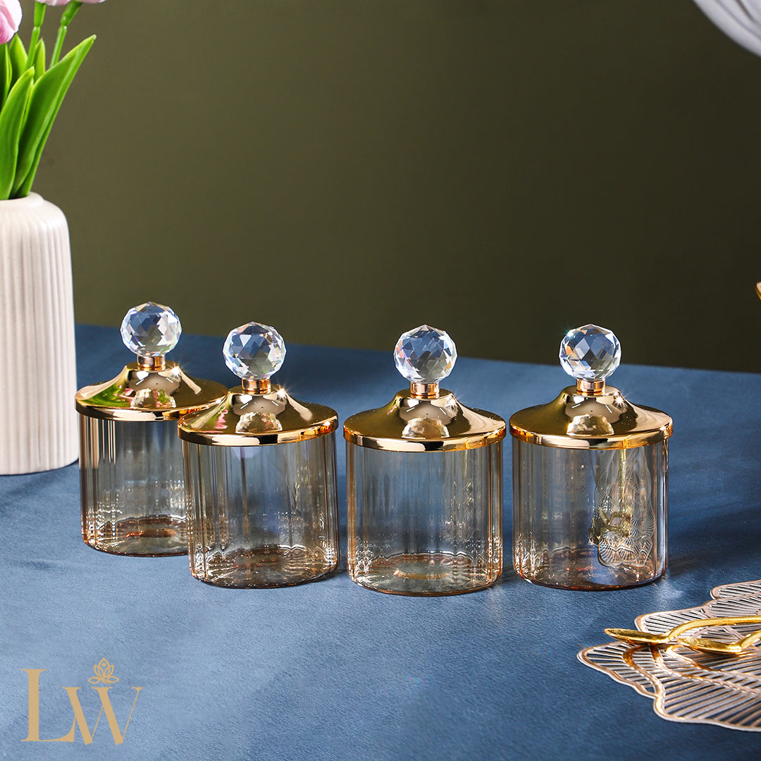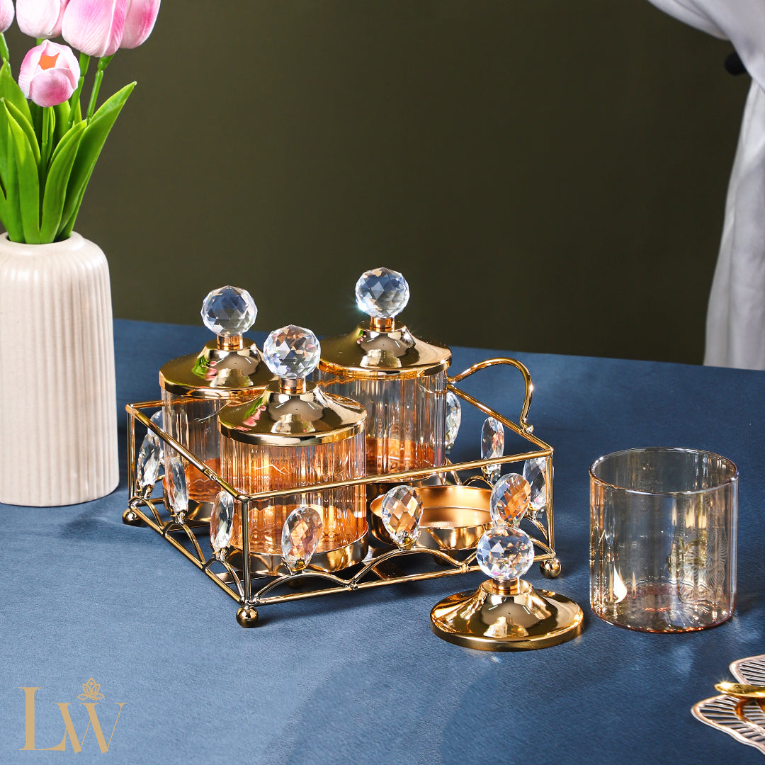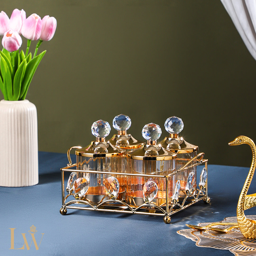 Add a touch of timeless sophistication to your home with this Crystal Golden Storage Jar Set. Designed with four premium jars topped with crystal-cut knobs and sleek Golden lids, this set exudes elegance in every detail. The jars are beautifully arranged in a sturdy Gold-toned holder, adorned with sparkling crystal embellishments, making it both a functional storage solution and a stunning centerpiece.