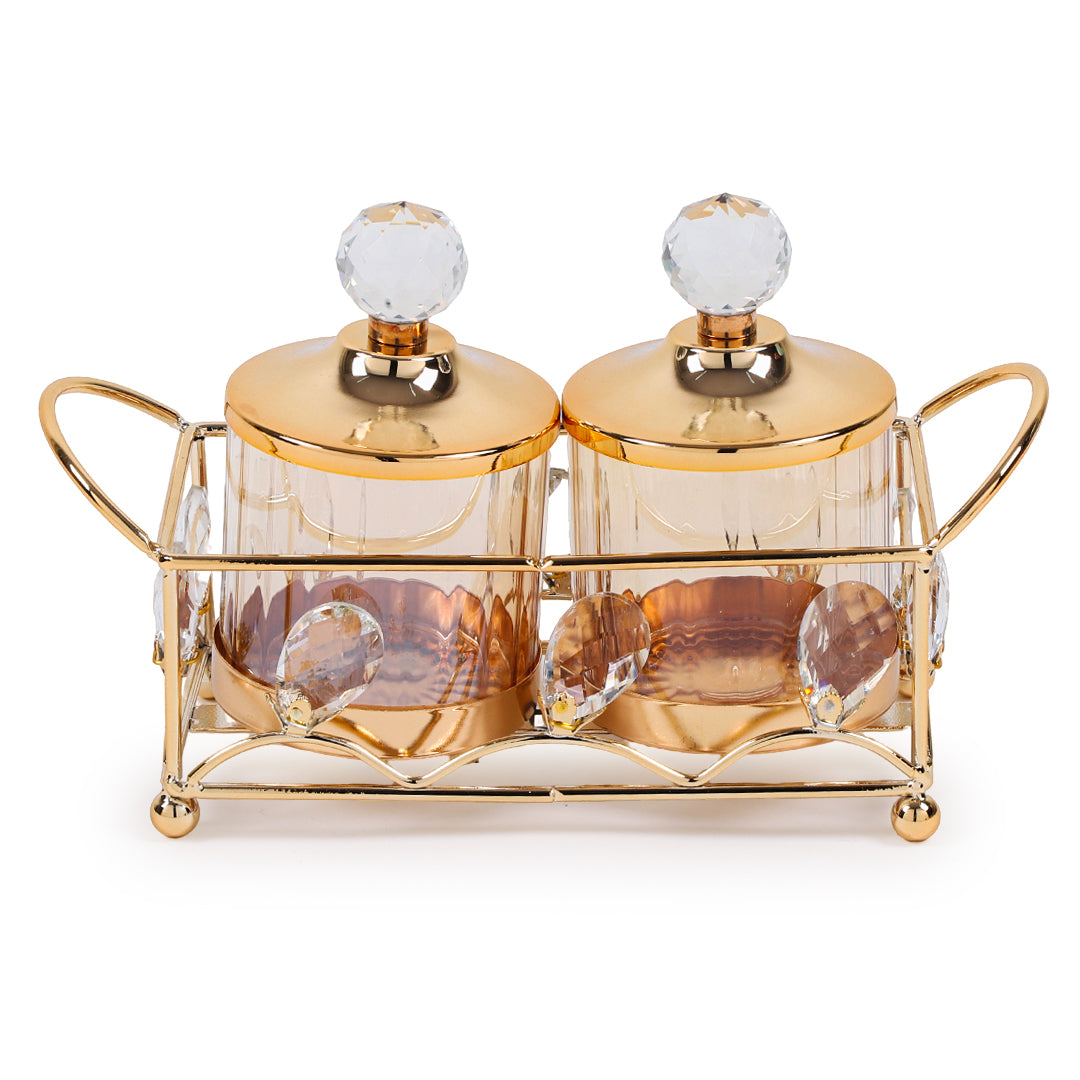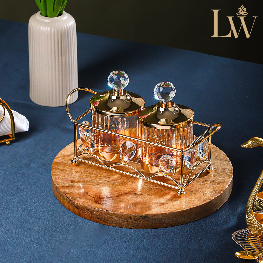 Add a touch of timeless sophistication to your home with this Crystal Golden Storage Jar Set. Designed with four premium jars topped with crystal-cut knobs and sleek Gold lids, this set exudes elegance in every detail. The jars are beautifully arranged in a sturdy Golden -toned holder, adorned with sparkling crystal embellishments, making it both a functional storage solution and a stunning centerpiece.