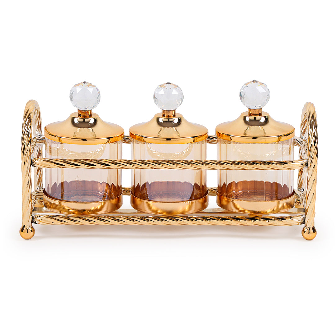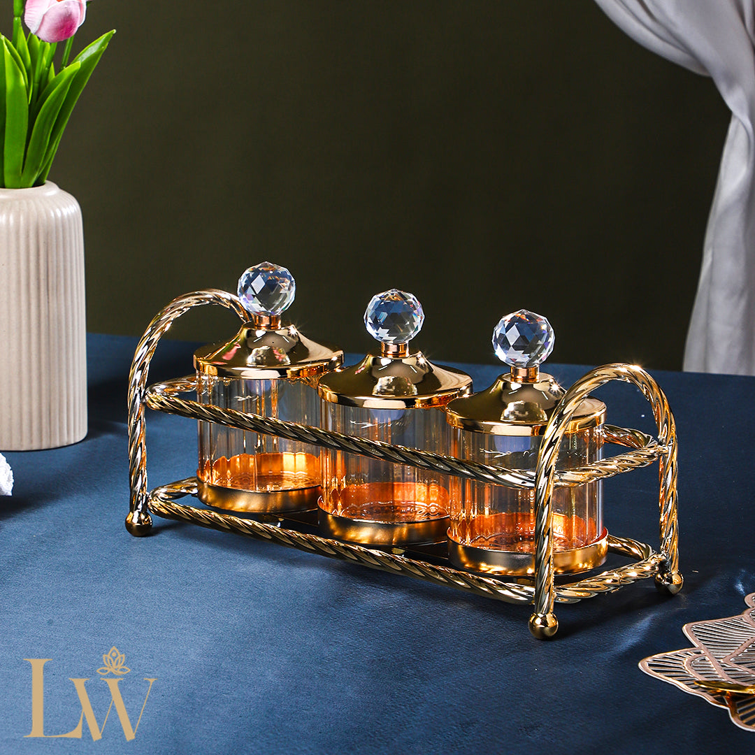 Add a touch of timeless sophistication to your home with this Crystal Golden Storage Jar Set. Designed with four premium jars topped with crystal-cut knobs and sleek Gold lids, this set exudes elegance in every detail. The jars are beautifully arranged in a sturdy Golden-toned holder, adorned with sparkling crystal embellishments, making it both a functional storage solution and a stunning centerpiece.