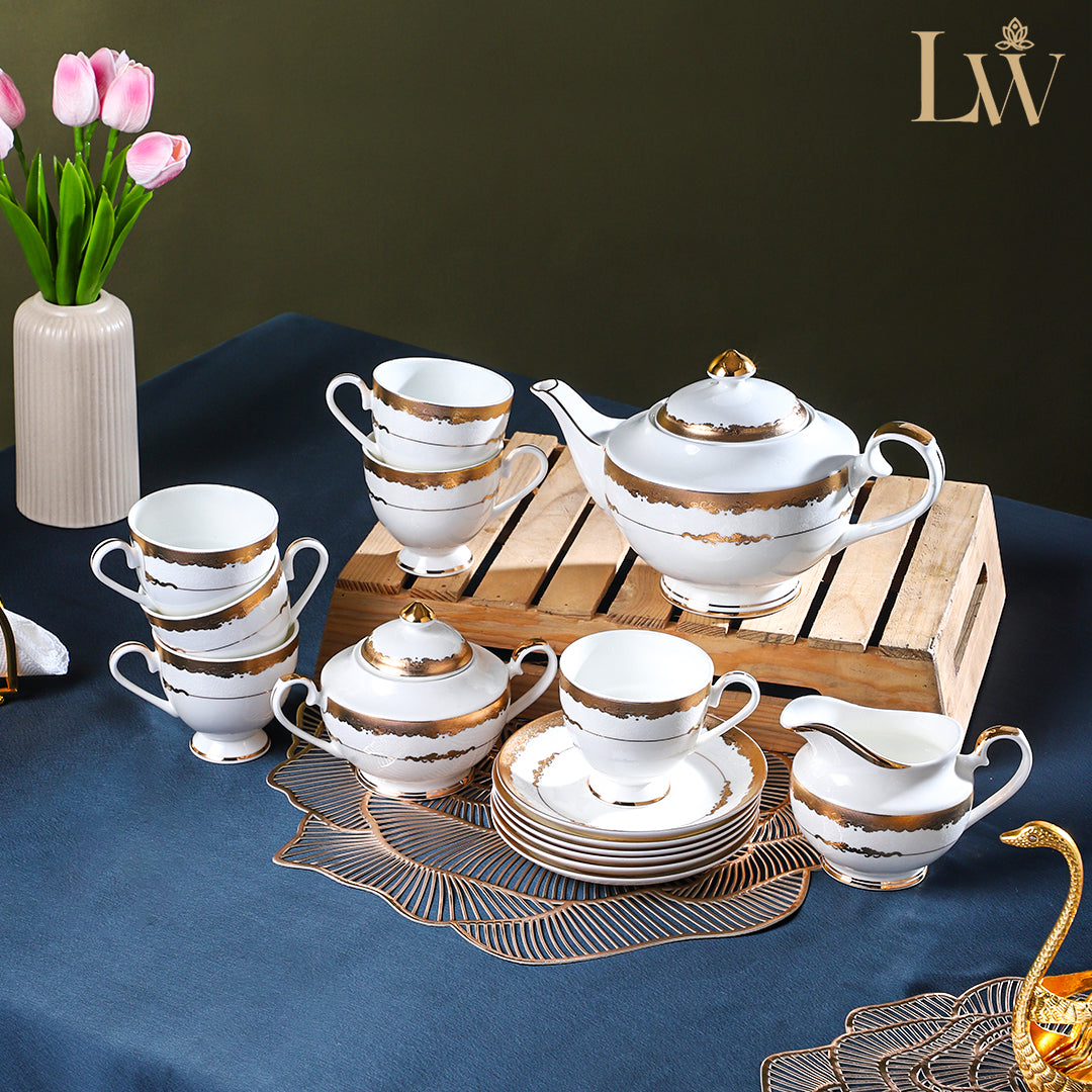 Indulge in the art of fine tea service with the Molten Gold Luxe Teaset from the Luxe Collection by Littlewoods. Crafted with precision in premium porcelain and finished with 24k Gold Plating, this 15-piece set exudes timeless elegance. The refined dual-gold band design adds a regal charm, making it a perfect centerpiece for high tea, intimate gatherings, or a touch of luxury in everyday moments.