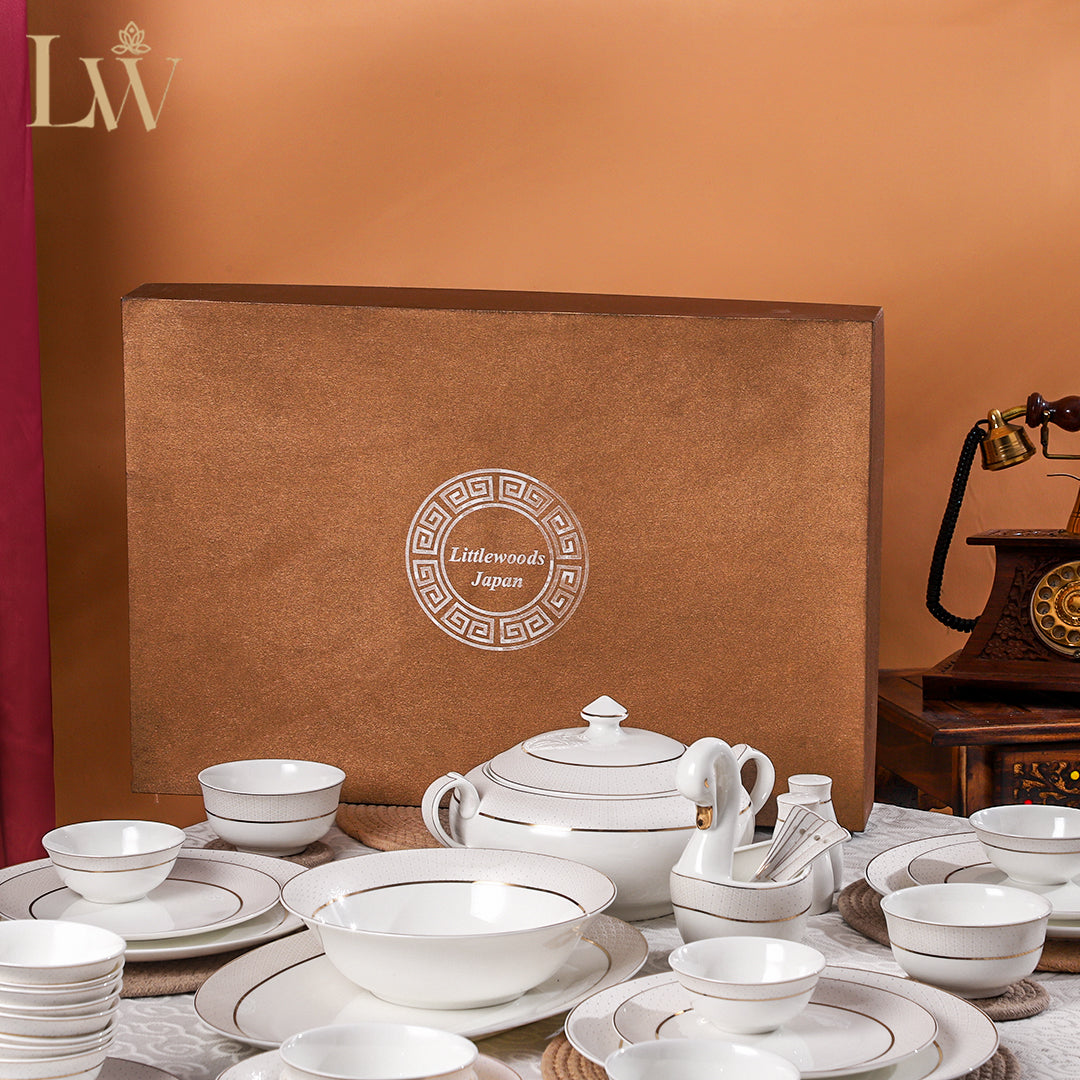The Pearl d’Or Dinner Set from the refined d’Or Collection is a timeless expression of sophistication and charm. Meticulously crafted in fine magnesium porcelain, it combines lightweight durability with a flawless, luxurious finish. The pure white surface, highlighted with golden detailing, mirrors the beauty of a luminous pearl — graceful, radiant, and everlasting. With 44 thoughtfully curated pieces, this set is perfect for everyday meals and grand celebrations alike.