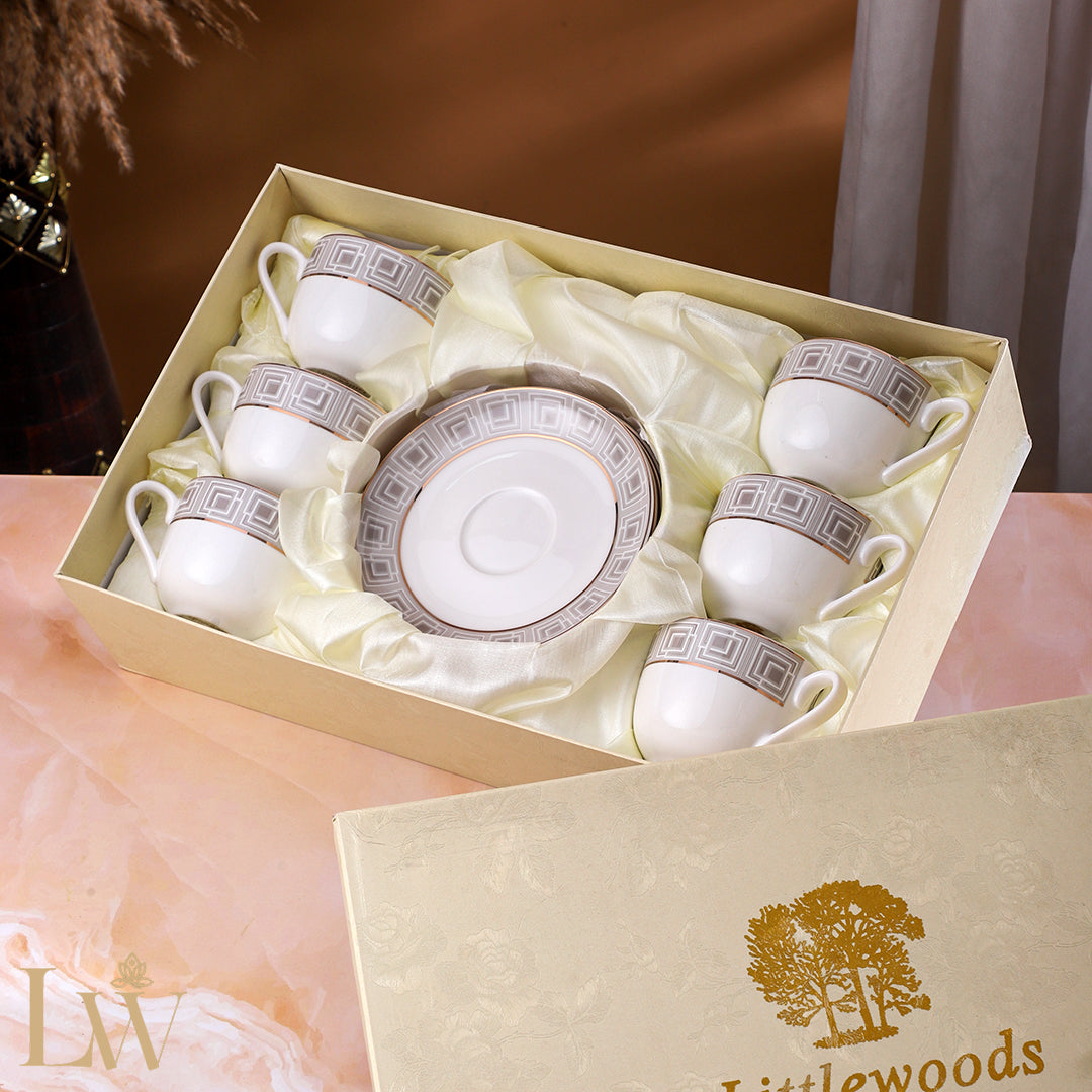Each set includes 6 finely crafted cups and 6 matching saucers, perfect for serving guests or enjoying your own quiet indulgence. The smooth ceramic finish ensures durability and comfort, while the refined detailing adds a touch of luxury to every sip. Thoughtfully packed in a premium box, this set makes an excellent gift for weddings, anniversaries, or festive occasions.