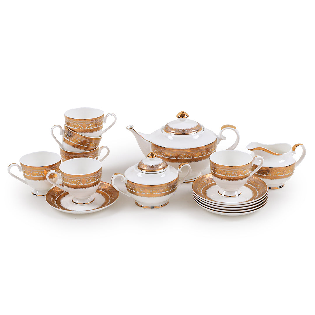 Indulge in the art of fine tea service with the Royal Gold Jewel Luxe Teaset from the Luxe Collection by Littlewoods. Crafted with precision in premium porcelain and finished with 24k Gold Plating, this 15-piece set exudes timeless elegance. The refined dual-gold band design adds a regal charm, making it a perfect centerpiece for high tea, intimate gatherings, or a touch of luxury in everyday moments.
