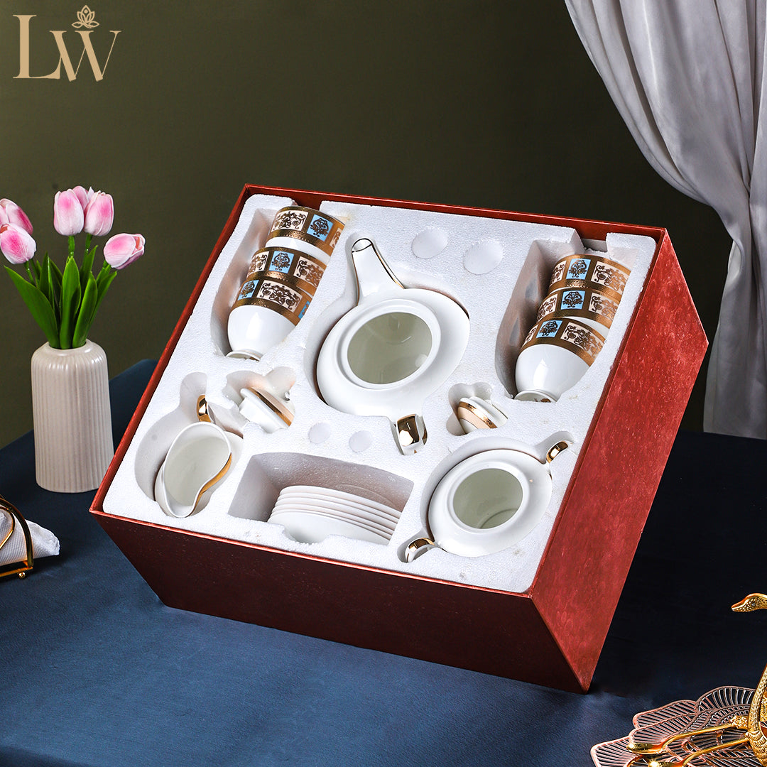 Indulge in the art of fine tea service with the Tiffany Blue Luxe Teaset from the Luxe Collection by Littlewoods. Crafted with precision in premium porcelain and finished with 24k Gold Plating, this 15-piece set exudes timeless elegance. The refined dual-gold band design adds a regal charm, making it a perfect centerpiece for high tea, intimate gatherings, or a touch of luxury in everyday moments.
